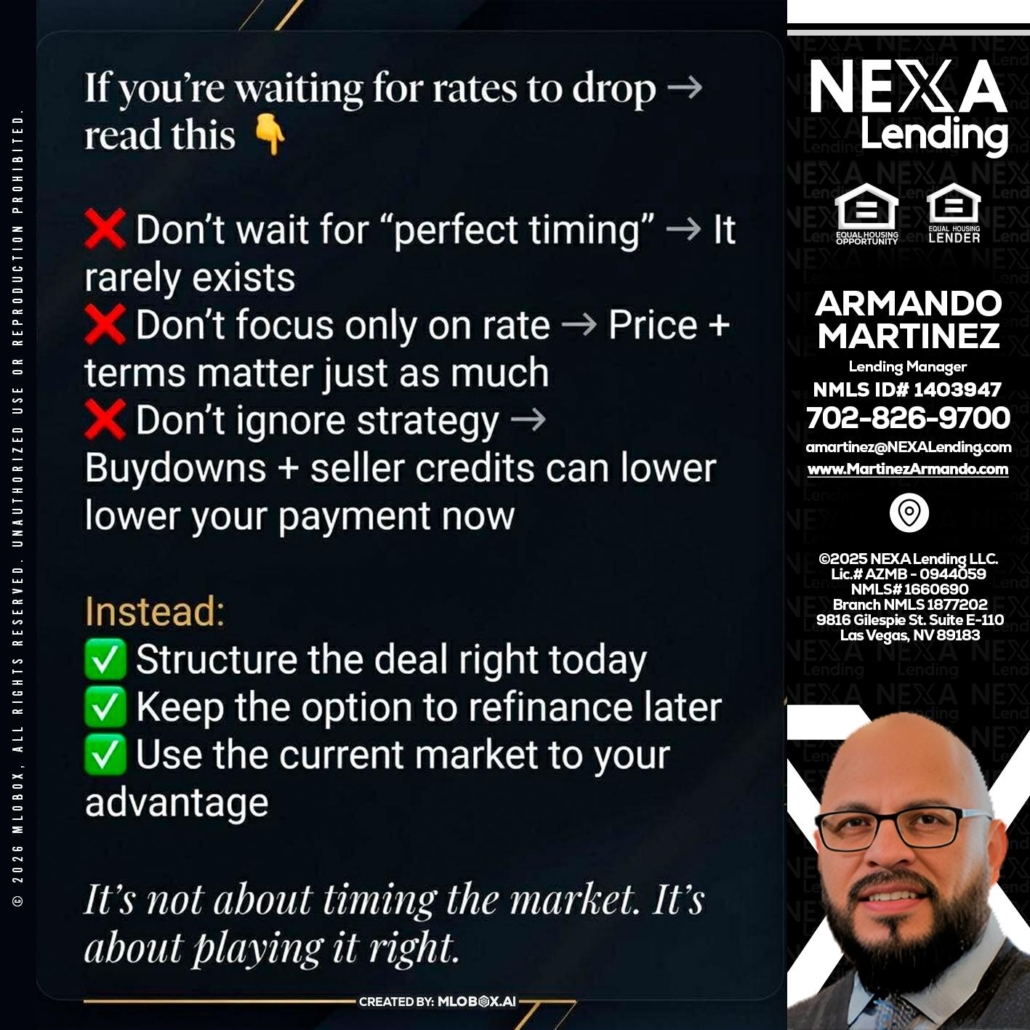 IF YOU ARE - Armando Martinez -Mortgage Loan OriginatorHi, my name is Armando Martinez. I’m a Loan Officer with NEXA Lending LLC., offering personalized mortgage solutions, fast customized quotes, great rates and service with integrity.