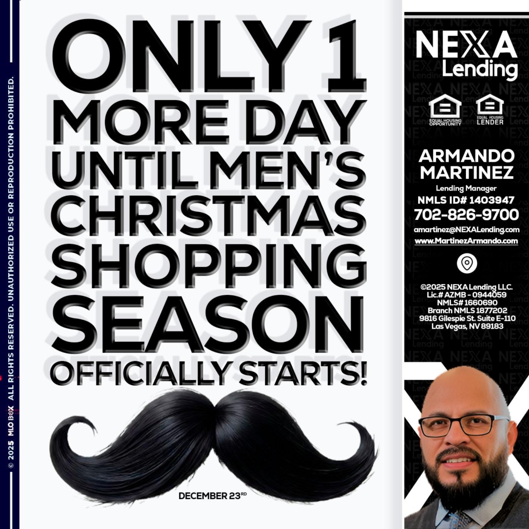 ONLY 1 DAY - Armando Martinez -Mortgage Loan OriginatorHi, my name is Armando Martinez. I’m a Loan Officer with NEXA Lending LLC., offering personalized mortgage solutions, fast customized quotes, great rates and service with integrity.